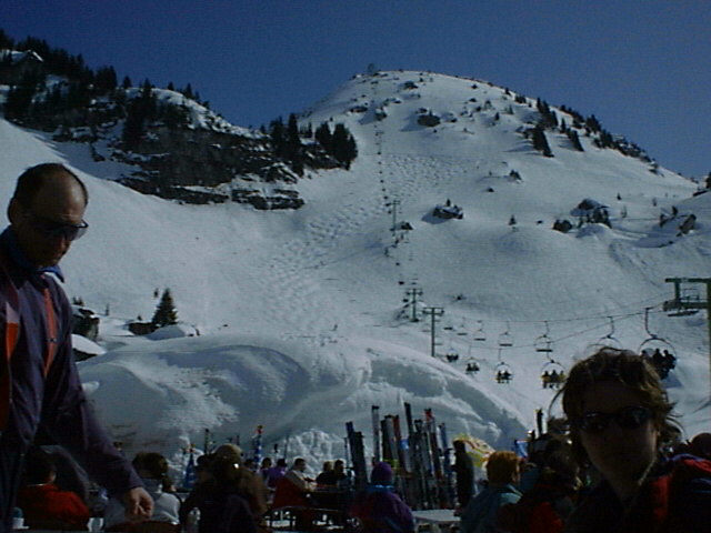 Chatel. View up the Black Run from Plaine Dranse.